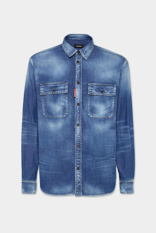 Introducing the men's denim shirt from the exclusive brand Dsquared2, embodying the essence of casual style with a touch of elegance. Made from the highest quality denim, it stands out with a beautiful blue shade featuring a washed effect, giving it a unique character.