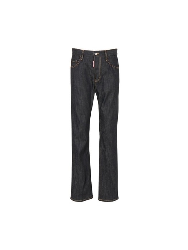 The denim fabric, featuring a classic diagonal weave and stretch, ensures exceptional comfort for everyday wear. The dark navy shade of the denim contrasts with prominent golden stitching, subtly highlighting each tailored line.
